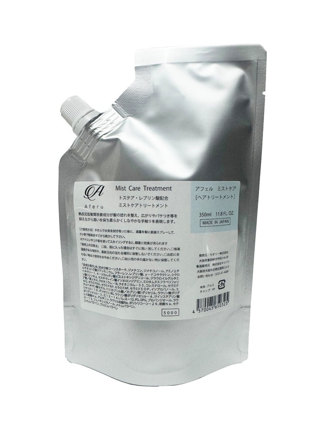髪を守り、育て、輝かせる奇跡のヘア化粧水。 自宅で出来る髪質改善トリートメントミスト。 [製品特長] ・熱反応型髪質改善成分 トステアを高配合 熱に反応する事で髪質を綺麗に整え、毛髪強度・カール保持・スタイル持続をサポート。 髪のうねり改善にも効果的です。 ・熱反応被膜成分 レブリン酸&エルカラクトンを高配合 コテやアイロン等の熱を味方に、輝くツヤを表現します。 潤いを長時間キープし、サラッとした指通りを実現します。 カラーの持続性アップとしても効果的です。 ・抗酸化成分 フラーレン配合 フラーレンの抗酸化作用で活性酸素を抑える事で、 コラーゲンの劣化を抑え潤いのある髪をキープします。 ・有効保湿成分 加水分解コーンスターチ 保湿の王様と言われるグリセリンよりも数倍高い保湿力を持ちます。 熱による水分の蒸発を補うのに最も効果的な保湿成分を高配合しました。 [香りの特長] やわらかく華やかなホワイトフローラルをベースに、 カシスやオレンジのフレッシュさがふわりと広がります。 その上に、ローズやジャスミンの上品なフローラルを重ね、 ラストはホワイトムスクやアンバーが調和し、 落ち着きと余韻を感じさせる香りへと仕上げました。 [使い方] 1、お風呂でシャンプー・トリートメントを行います。 2、お風呂上がりにタオルで水分を拭き取ります。 3、アフェルミストを髪全体に適量スプレーして、指やコーム等で馴染ませます。 4、しっかりドライヤーで乾かします。 ※仕上げにアイロンやコテ等の熱を入れるとより効果的になります。